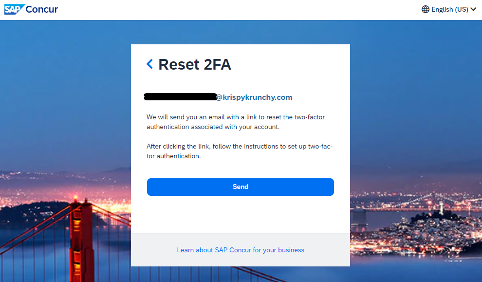 6. After hitting “Send” when the page loads you will be sent an email from ‘noreply@concur.com’ with subject “Two-Factor Authentication Reset Request”.